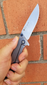 Теперь относительно экземпляра доставшегося мне. Опять шпеньки для открывания. Буквально за 2-3 дня, та что находится со стороны фрейма, начала светлеть - вытираться. При том что я правша и своими попытками открыть нож пальцем я насиловал другую бонку. Впрочем это чисто эстетическая сторона, со временем вся синька облезет. Клинок, из коробки, мне досталась заточка заваленная на один бок, не по всей длине конечно, а уже конец, но в сложенном виде при взгляде на обух это смотрится довольно обидно, нож то новый. Но это не все, самое досадное это люфт, продольный люфт, появившийся буквально через неделю. И я кстати не флипал день и ночь. Но даже если бы это было так, то все равно это очень уж быстро. В чем причина не знаю, если при открывании фрейм как бе додавливать то люфта нет, но стоит дать нагрузку на клинок, опять есть. А бывает даже и додавливание фрема не решает проблему. То ли фрейм ослаб.... То ли геометрию свели плохо... Может дело в стопорной бонке. Она на моем экземпляре свободно вращается и имеет небольшой люфт из стороны в сторону. Бывает её провернешь и люфт клинка пропадает. Пока отрезал полоску скотча, обернул её по кругу, так все хорошо... Но досадно очень. Ведь ножу то еще и месяца нет, никаких нагрузок он не испытывал, не ронялся, и не разбирался, так только бумагу кромсал и колбаску на корпоративе.