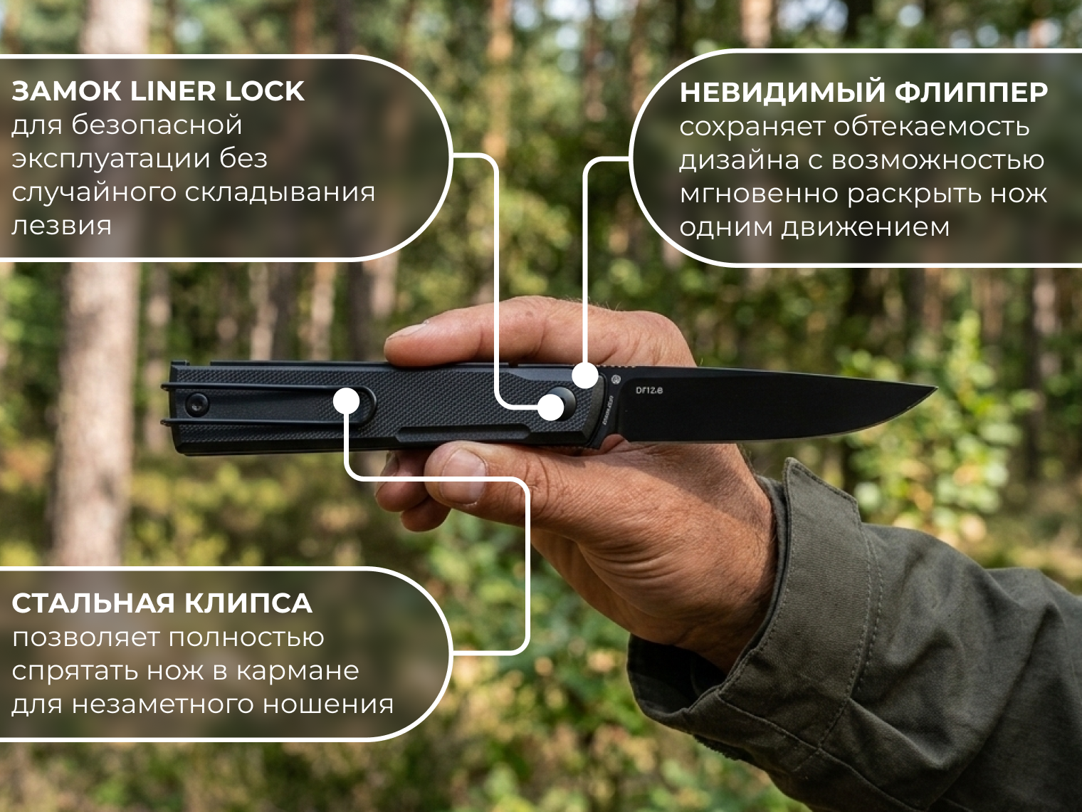 Черный цвет клинка, рукояти и даже мелких деталей (винтов и клипсы) делает нож незаметным и сдержанным. Он не привлекает лишнего внимания и выглядит как стильный аксессуар.