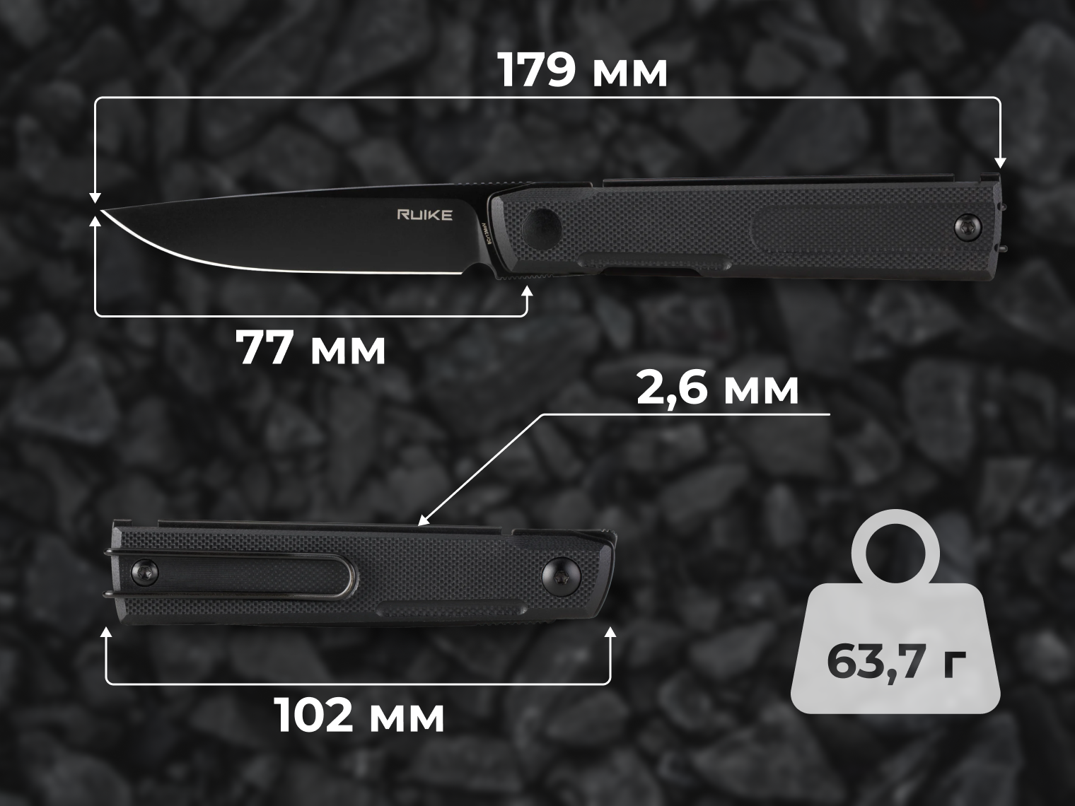 Сверхлегкий карманный нож Ruike в полностью черном цвете. Открывается мгновенно благодаря фронтальному флипперу. Форма клинка Drop Point с заниженной линией обуха делает нож универсальным. Лезвие из стали 8Cr13MoV с твердостью 57-59 HRC и черным защитным покрытием. Черная рукоять из материала G10 обеспечивает надежное удержание. Весит всего 63.7 г, поэтому он почти не чувствуется в кармане.