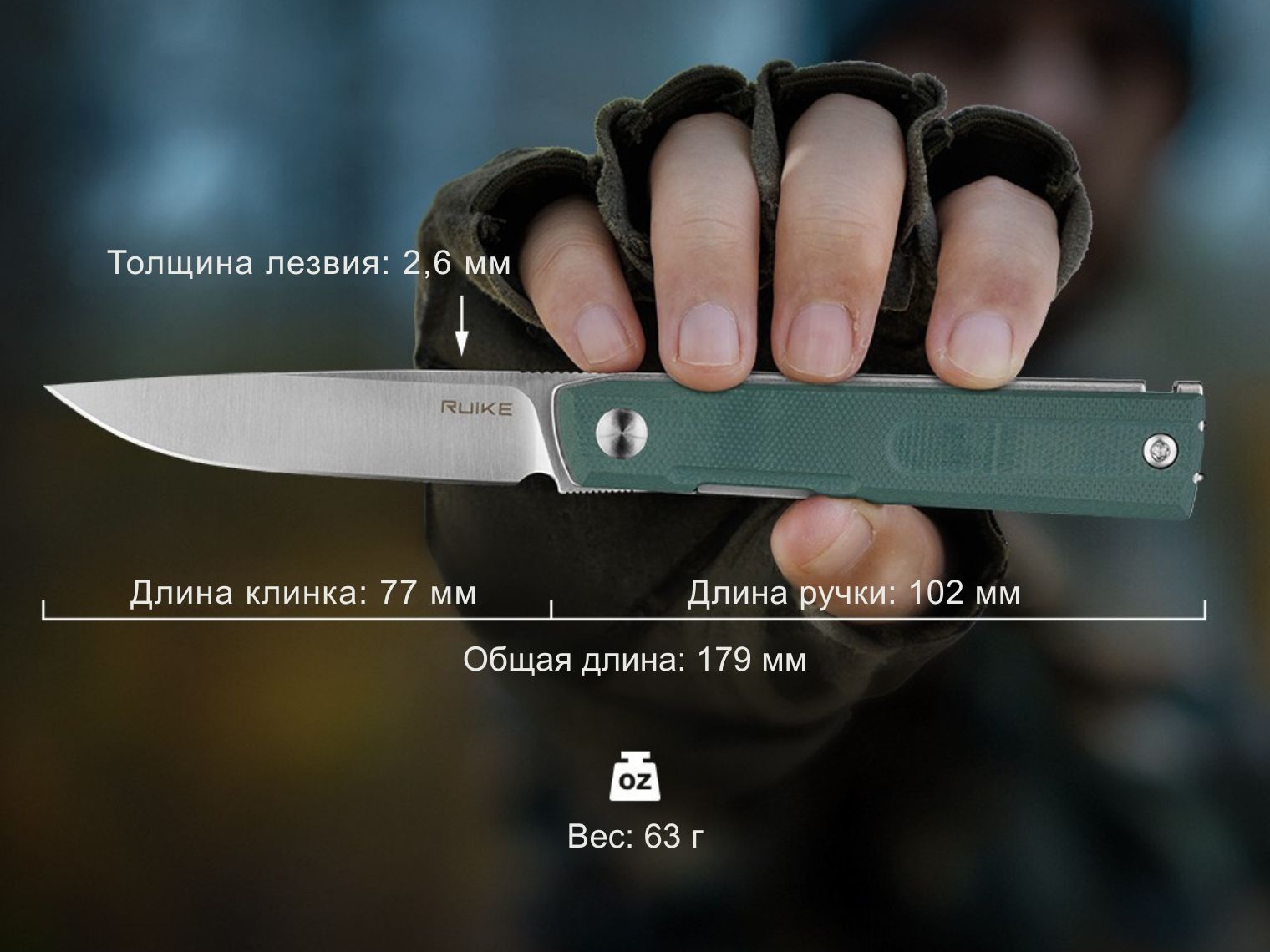 Сверхлегкий складной нож Ruike D712-G имеет минималистичный дизайн с фронтальным флиппером для мгновенного открытия. Клинок Drop Point с плавным сужением к острию подходит для реза и прокалывания. Лезвие выполнено из стали 8Cr13MoV с криогенной обработкой. Рукоять из G10 гарантирует крепкий хват. Тип замка: Liner Lock. Нож весит 63.7 г с учетом клипсы для скрытого ношения.