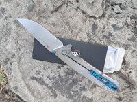 Теперь относительно экземпляра доставшегося мне. Опять шпеньки для открывания. Буквально за 2-3 дня, та что находится со стороны фрейма, начала светлеть - вытираться. При том что я правша и своими попытками открыть нож пальцем я насиловал другую бонку. Впрочем это чисто эстетическая сторона, со временем вся синька облезет. Клинок, из коробки, мне досталась заточка заваленная на один бок, не по всей длине конечно, а уже конец, но в сложенном виде при взгляде на обух это смотрится довольно обидно, нож то новый. Но это не все, самое досадное это люфт, продольный люфт, появившийся буквально через неделю. И я кстати не флипал день и ночь. Но даже если бы это было так, то все равно это очень уж быстро. В чем причина не знаю, если при открывании фрейм как бе додавливать то люфта нет, но стоит дать нагрузку на клинок, опять есть. А бывает даже и додавливание фрема не решает проблему. То ли фрейм ослаб.... То ли геометрию свели плохо... Может дело в стопорной бонке. Она на моем экземпляре свободно вращается и имеет небольшой люфт из стороны в сторону. Бывает её провернешь и люфт клинка пропадает. Пока отрезал полоску скотча, обернул её по кругу, так все хорошо... Но досадно очень. Ведь ножу то еще и месяца нет, никаких нагрузок он не испытывал, не ронялся, и не разбирался, так только бумагу кромсал и колбаску на корпоративе.