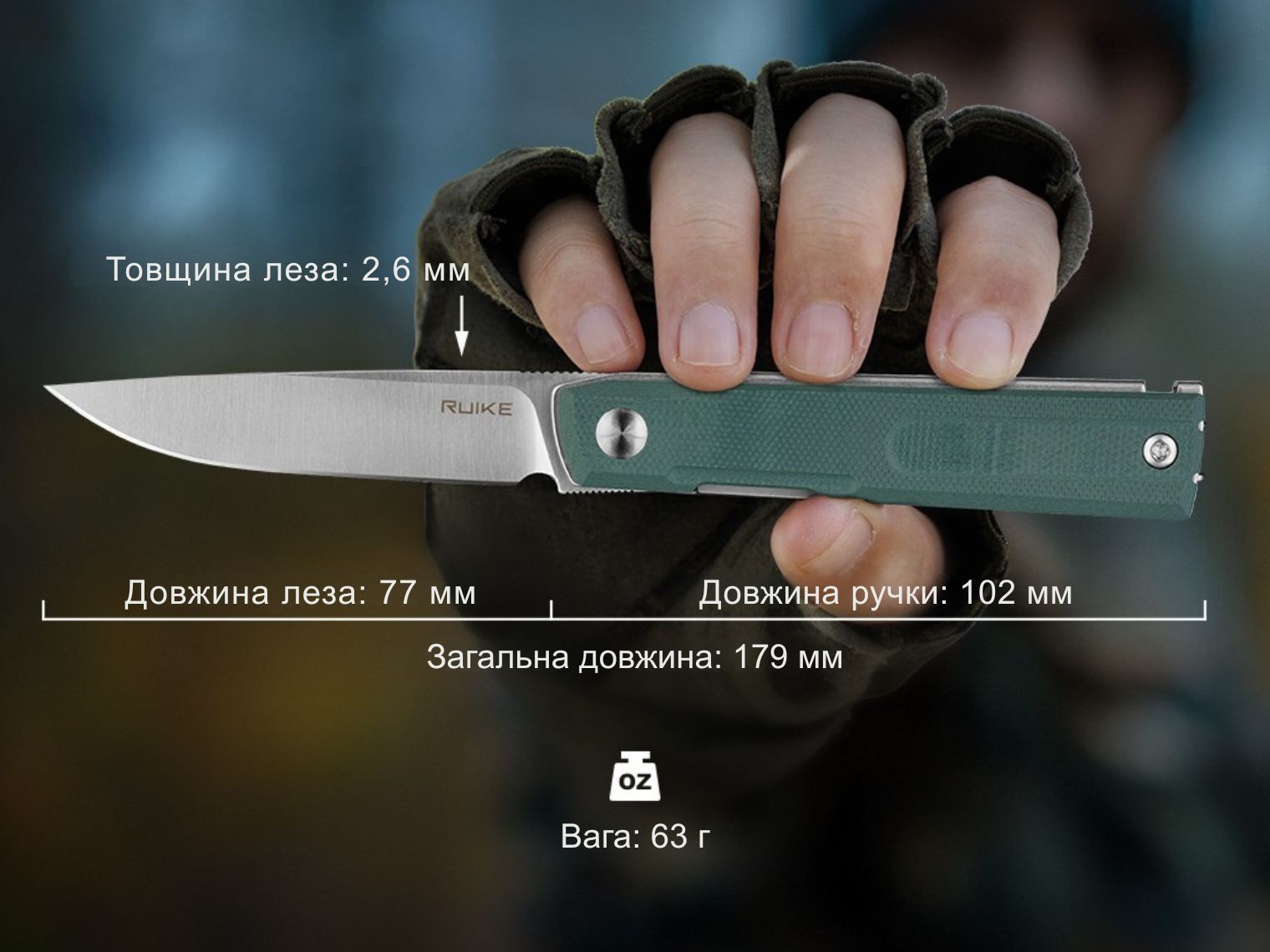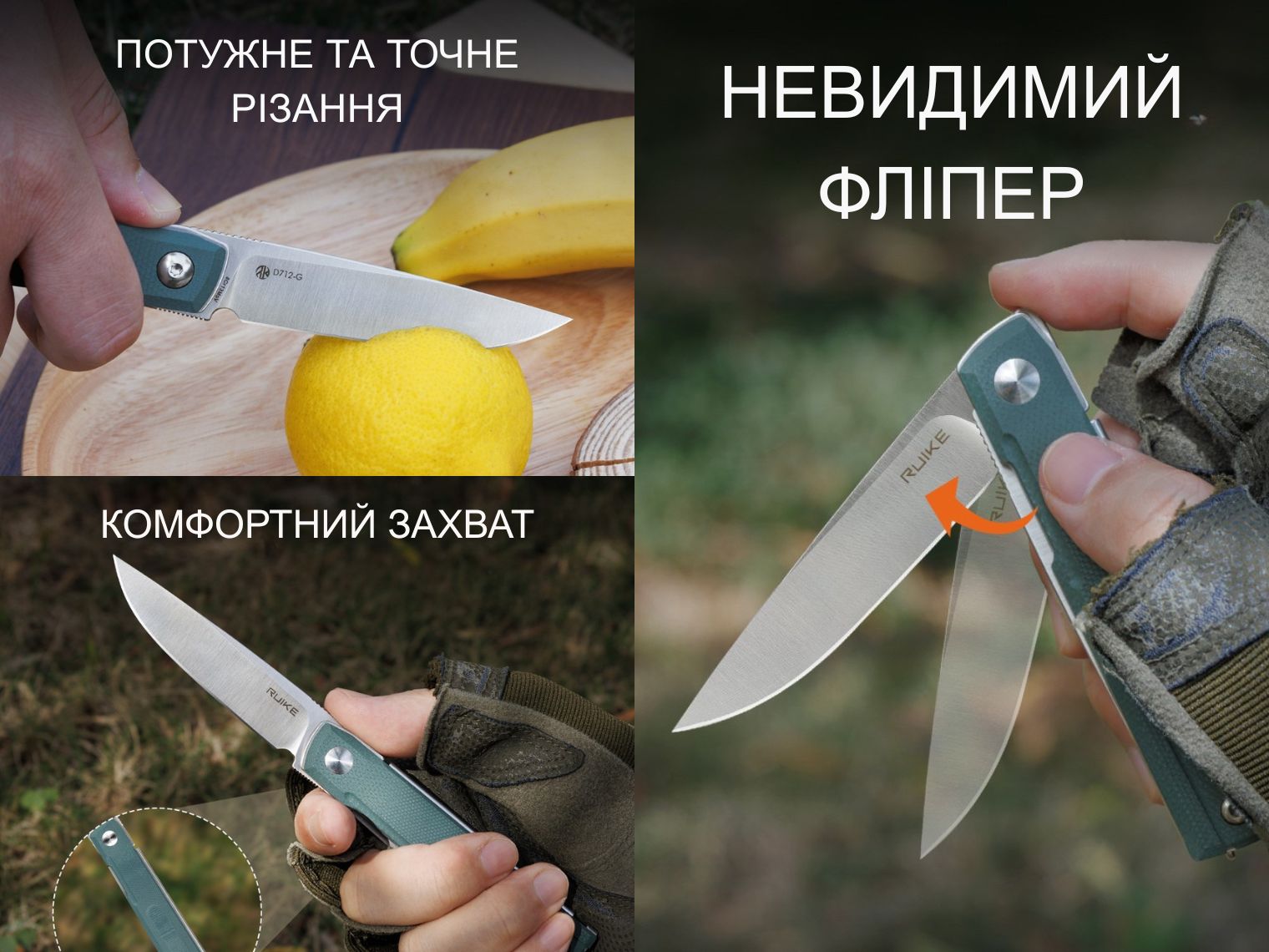 Надлегкий складаний ніж Ruike D712-G має мінімалістичний дизайн із фронтальним фліпером для миттєвого відкриття. Клинок Drop Point з плавним звуженням до вістря підходить для різання та проколювання. Лезо виконано зі сталі 8Cr13MoV з кріогенною обробкою. Руківʼя з G10 гарантує міцний хват. Тип замка: Liner Lock. Ніж важить 63.7 г з урахуванням кліпси для прихованого носіння.