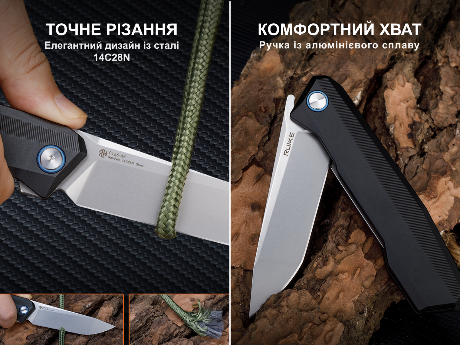Повнорозмірний складаний ніж Ruike P166 з клинком з нержавіючої сталі Sandvik 14C28N (HRC 57–59). Форма клинка Tanto забезпечує контрольоване різання та стійкість до високих навантажень. Миттєве відкриття однією рукою натисканням на прихований фліпер. Замок Liner Lock. Руківʼя з алюмінієвого сплаву робить інструмент дуже легким (127 г). Є сталева кліпса на кишеню.