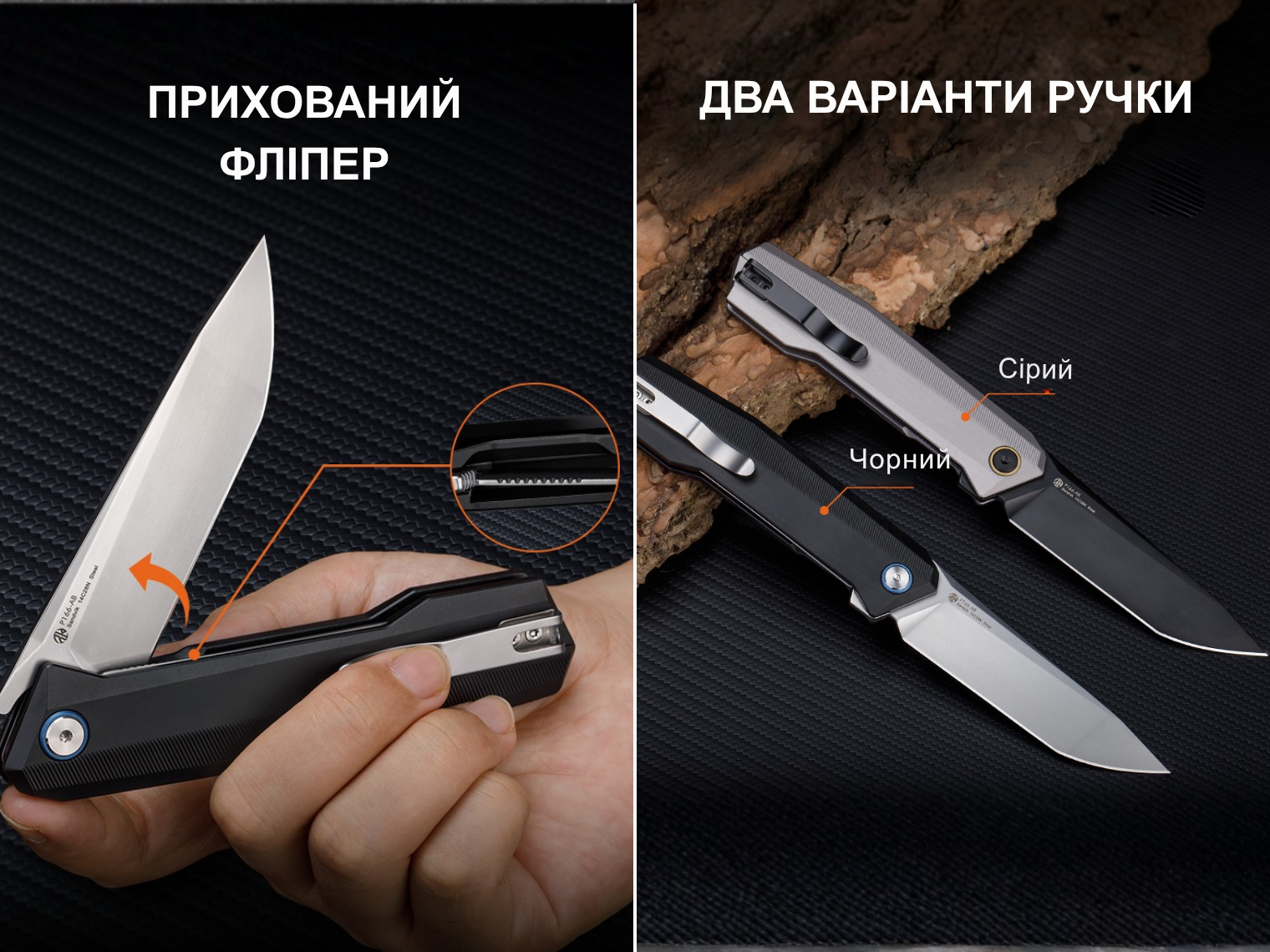 Ruike P166 відкривається за допомогою прихованого фліпера, який не має вираженого виступу. Це рішення зберігає чисті лінії ножа, роблячи його форму максимально обтічною для зручного носіння.